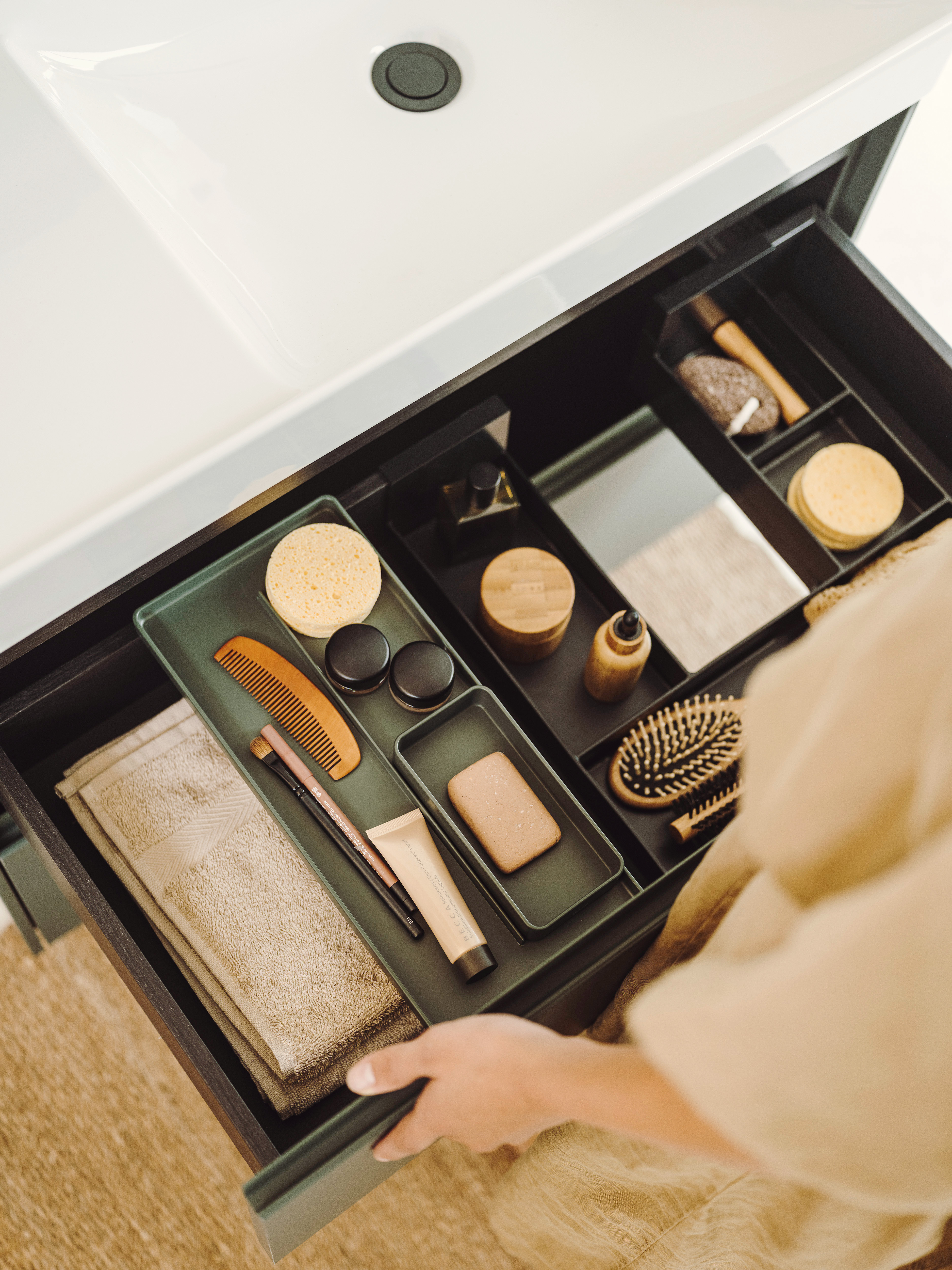 Una buena organización no se basa únicamente en la practicidad; también depende de la percepción. Si todo está en su sitio, el espacio de baño parece más amplio y acogedor. Los accesorios de la colección Ona, entre los que se encuentran los dispensadores de jabón, los portacepillos y las bandejas con acabados a juego, crean armonía visual y reducen el desorden, tan molesto en un baño pequeño. Todos estos detalles facilitan las rutinas diarias y te hacen la vida más fácil.