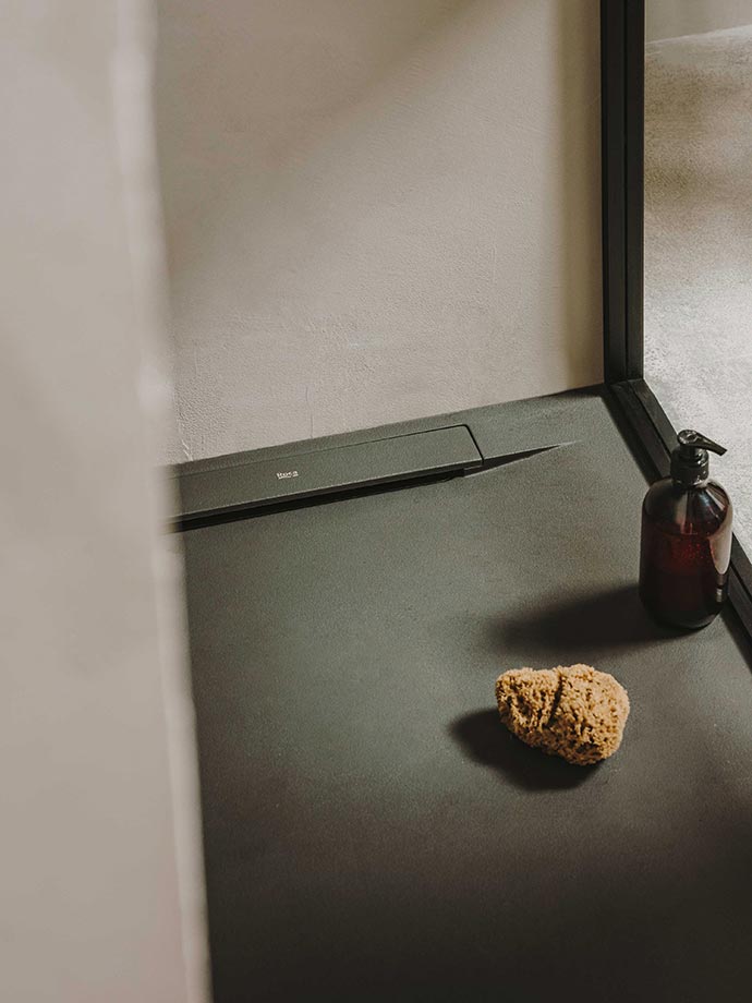 El plato de ducha a ras de suelo es uno de los elementos clave en el diseño de este espacio. Los platos de ducha Terran y Pyros se instalan a ras de suelo y su tamaño puede ser personalizado para crear una sensación parecida a la de un spa dentro de la ducha. Las colecciones Terran y Pyros cuentan con una amplia variedad de acabados tierra en tonos apagados que crean una estética sofisticada, en línea con el interiorismo del baño. Los platos están fabricados en Stonex® y cuentan con una suave textura similar a la piedra que añade un elemento natural al espacio, además de ser antideslizantes y fáciles de limpiar.