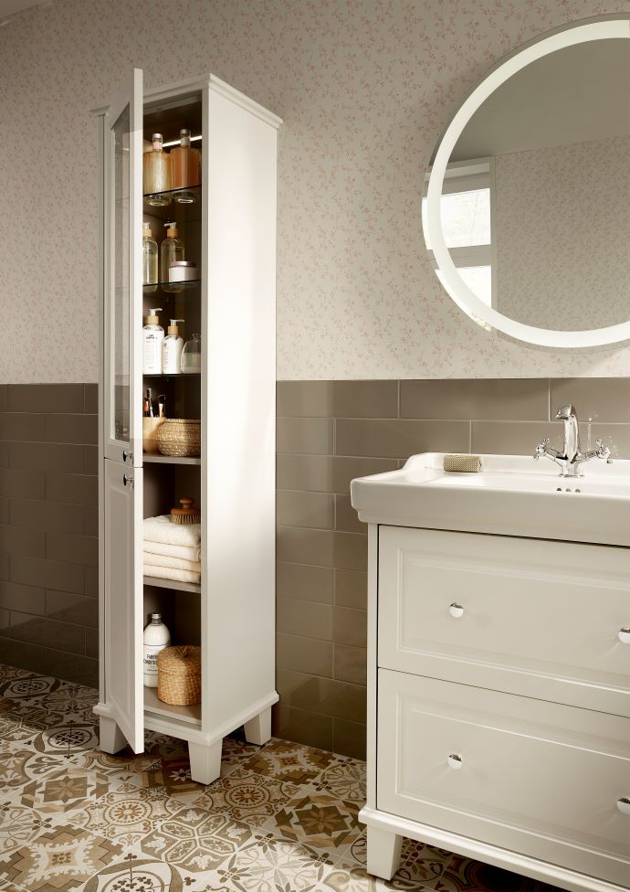Elige siempre materiales resistentes a la humedad, como la madera tratada, el metal o los laminados hidrófugos. Los acabados como el negro mate, el veteado natural de la madera o el elegante blanco brillante pueden complementar o añadir un marcado contraste a la paleta de colores de tu baño. Con veinte acabados diferentes, el armario alto de una puerta Extra ofrece múltiples opciones de diseño y colorido para realzar el espacio de baño. Si tu estilo es más minimalista y moderno, opta por líneas depuradas y tonos neutros. Si prefieres un look más ecléctico o rústico, elige piezas de inspiración vintage, como la columna de una puerta de la colección Carmen con estantes regulables en altura, y lograrás aportar un plus de elegancia.