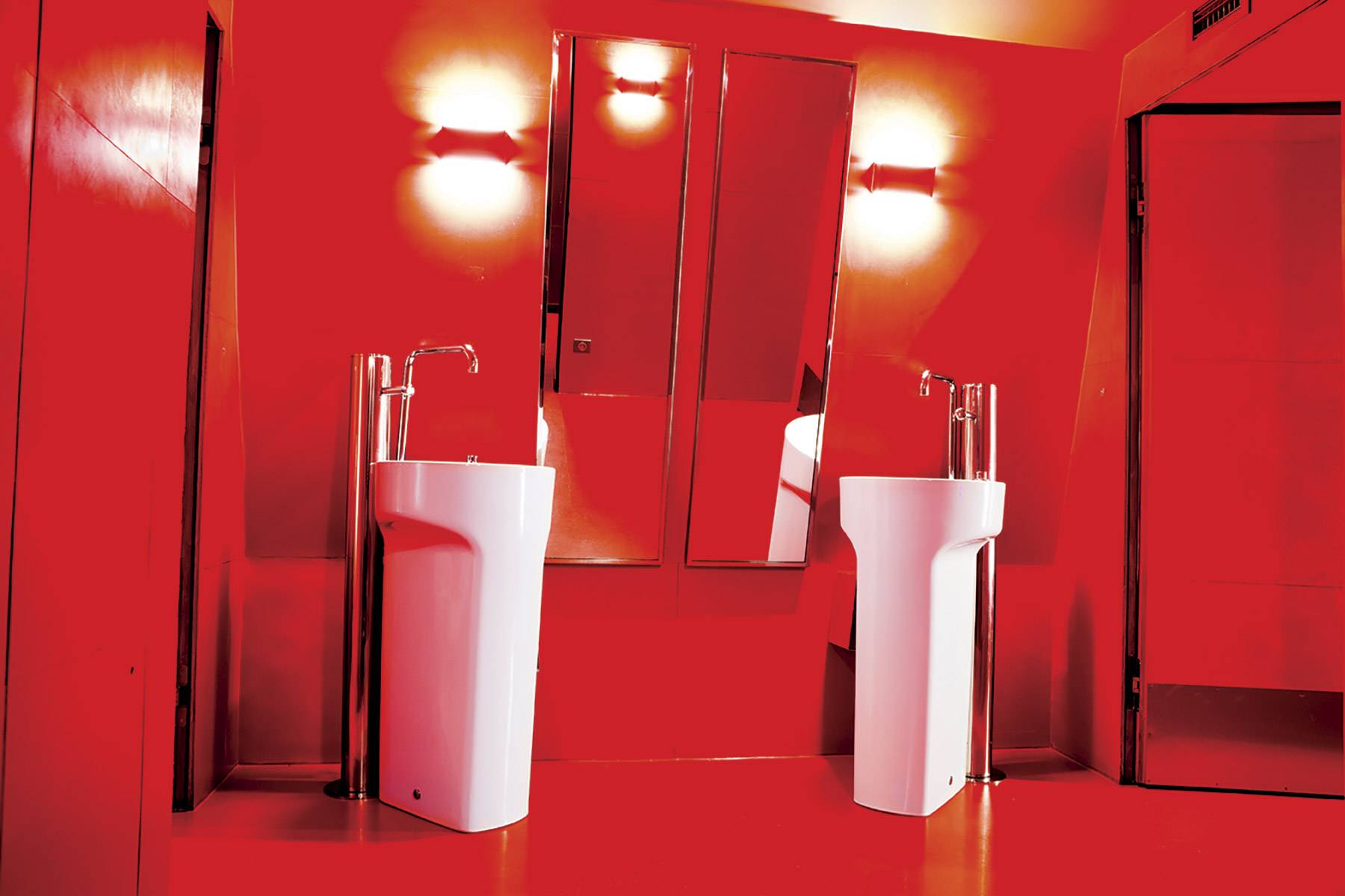 Ocupando dos alturas y con el objetivo de integrar al visitante, el pabellón Ferrié, por su parte, ofrece una pequeña zona comercial, servicios de restauración, una sala de proyecciones y un recorrido museográfico al aire libre con diversas zonas de descanso. Su uso abierto a todos los visitantes supuso todo un reto a la hora de proyectar espacios de aseo que cumplieran con las más altas prestaciones de durabilidad y resistencia. Aquí, Moatti optó por una edición especial combinando algunas de las colecciones contemporáneas de Roca. El lavabo Diverta, el urinario Site y, de nuevo, el inodoro Meridian en su versión suspendida, fueron diseñados en un llamativo acabado en rojo para rendir homenaje al color con el que Gustave Eiffel proyectó inicialmente su mítica torre, símbolo de la Exposición Universal de 1889.
