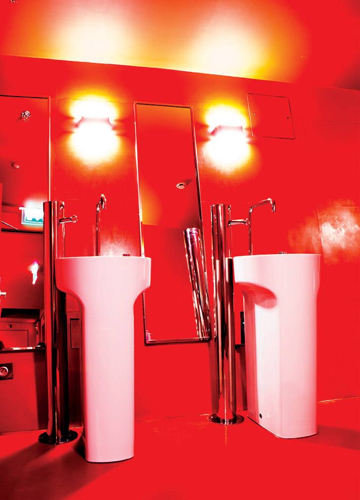 Concebido para uso privado, el pabellón Eiffel, en el primer piso, cuenta con una sala de conferencias con capacidad para 300 personas y fue el primer espacio de la torre en usar toda la gama de productos Roca desde la porcelana a la grifería, pasando por los sistemas de instalación y las placas de accionamiento. Dispuesto en un espacio de paredes de intenso rojo veneciano, el blanco de los urinarios, inodoros y lavabos Roca contrasta con el llamativo tono de la pared, que fue en su día el original de toda la torre. Inspirándose en este dato desconocido para muchos visitantes, el arquitecto responsable del proyecto, Alain Moatti, eligió el lavabo Amberes y el inodoro Meridian en su versión suspendida para crear un contraste entre curvas y rectas, firmando su personal homenaje en un diálogo entre el rojo y el blanco.