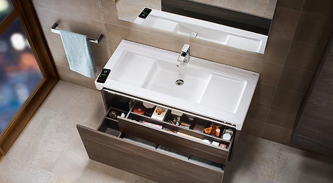 Si todo almacenaje te parece insuficiente, te conquistarán los muebles para lavabo de baño que incorporan grandes cajones de extracción completa, además del sifón ahorra espacio que evita cualquier recorte en su superficie. Si aún te parece poco, descubre cajones que juegan con sus medidas para que guardes enseres de distintos tamaños, así como compartimentos ocultos para que conserves tus objetos más preciados. Y todavía puedes añadir varios extras más, como iluminación interior y hasta altavoces Bluetooth® que se conectarán con tu Smartphone para que permanezcas eternamente conectado.