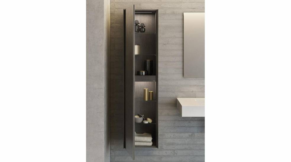 Y es que todo en esta colección ha sido pensado para garantizar el mayor confort y la máxima calidad, como por ejemplo los cajones de los muebles, con sistema de extracción completa, interior dividido en compartimentos con acabado texturizado en madera oscura agradable al tacto y sistema de cierre amortiguado y silencioso; o los módulos columna, que incorporan iluminación interior, baldas de cristal y espejo de cuerpo entero.