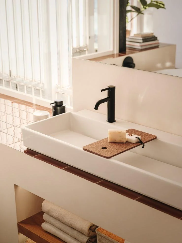 ✓ Tapa de corcho reciclado para las cajas que también sirve de bandeja para los lavabos.