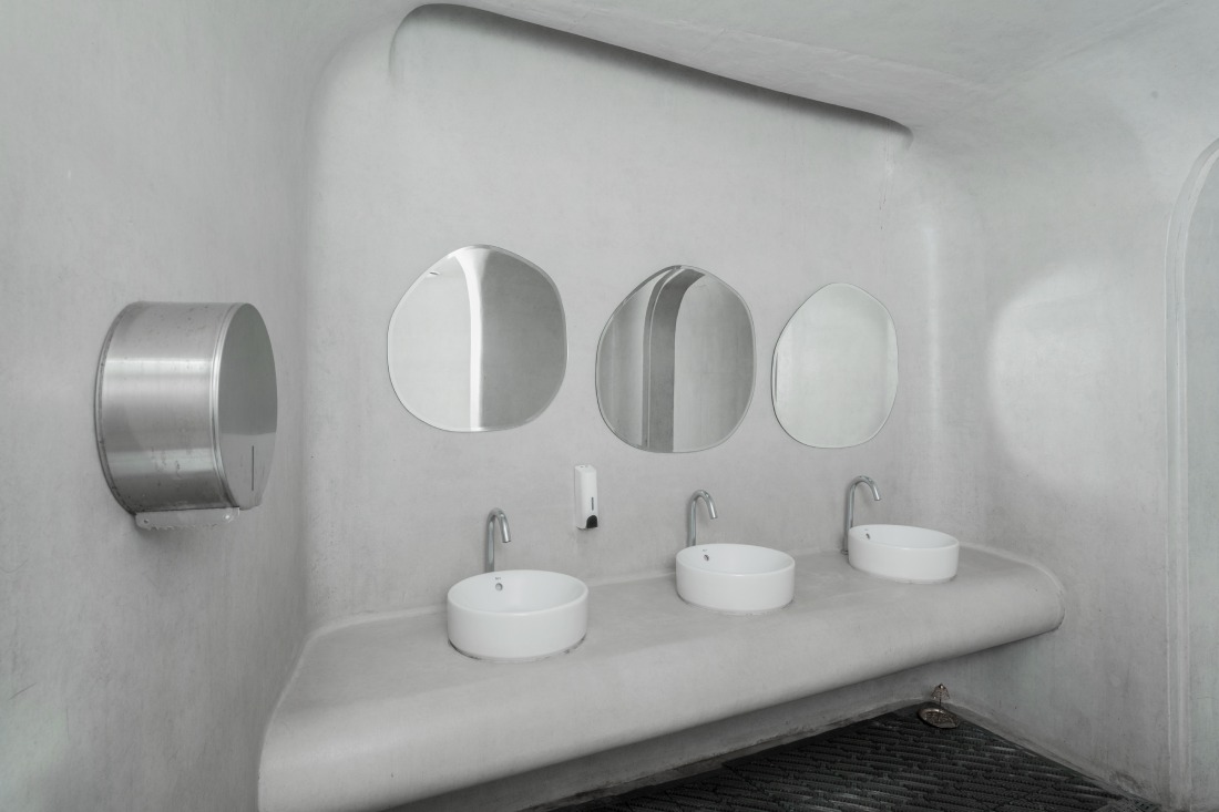 La búsqueda de un lavabo que encajara en las encimeras a medida de los aseos públicos culminó con la elección del modelo Round de la exitosa colección The Gap. Considerado un clásico contemporáneo en el diseño de baños, sus elegantes formas minimalistas y curvilíneas son el complemento perfecto de las líneas orgánicas de los muebles de baño. Del mismo modo, la innovadora grifería electrónicaLoft se funde con el llamativo lenguaje visual del espacio. Las líneas sobrias del urinario electrónico Euret también actúan como un elemento de diseño al tiempo que proporcionan un importante ahorro de agua y energía con sus funciones inteligentes.