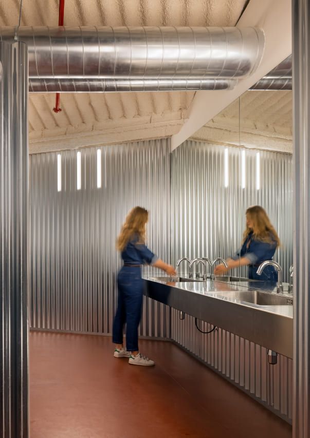 Los baños constituyen el núcleo de esta transformación, convirtiéndose en un espacio concebido como una necesidad, pero también como un santuario para los empleados. Las paredes onduladas de acero evocan la fachada del edificio, creando una sensación de continuidad y añadiendo un toque futurista. El diseño minimalista es a la vez llamativo y funcional, y los suelos rojos contrastan con las superficies metálicas para crear un espacio íntimo y espacioso.