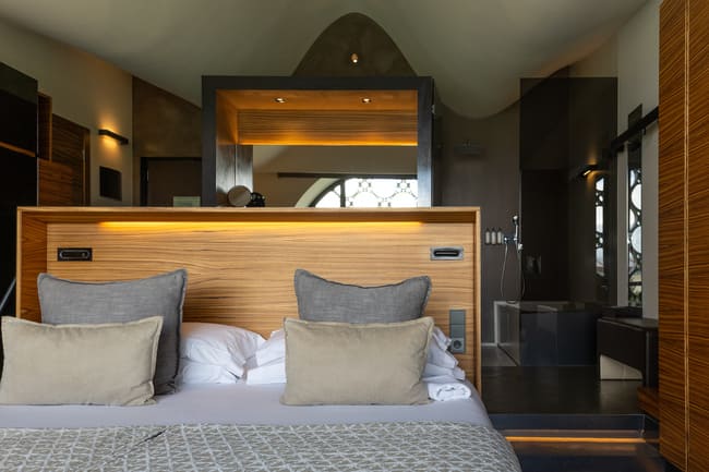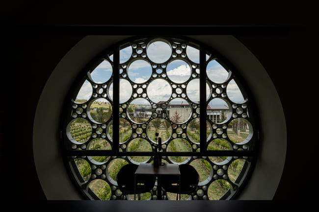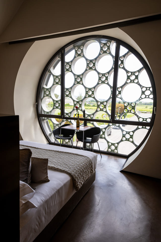 En el interior, el hotel continúa inspirándose en su entorno natural. En las habitaciones, las líneas sinuosas del edificio dan paso a suaves techos curvos que acentúan la sensación de amplitud. Grandes ventanales circulares con motivos geométricos permiten que la luz natural inunde las estancias, ofreciendo unas vistas espectaculares de los viñedos. El uso de madera, vidrio y detalles en negro crea un ambiente armonioso y elegante que conjuga el diseño contemporáneo con los elementos naturales.
