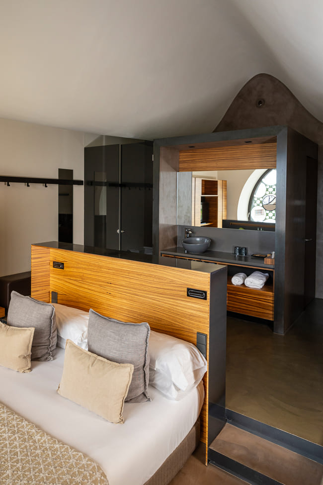 La vistosa grifería Thesis, diseñada por Antonio Bullo, presenta un diseño moderno y dinámico de líneas limpias y formas minimalistas, que aportan elegancia y estilo al espacio de baño. El histórico lavabo Bol en color grafito, colocado sobre una encimera de madera, y el inodoro Happening, de inspiración arquitectónica, contribuyen a la sofisticada estética de las habitaciones, reforzando su conexión con la arquitectura del hotel y su entorno. Este interiorismo es el ejemplo perfecto de cómo el diseño moderno puede combinarse de forma armoniosa con elementos tradicionales para crear espacios funcionales y visualmente impactantes.