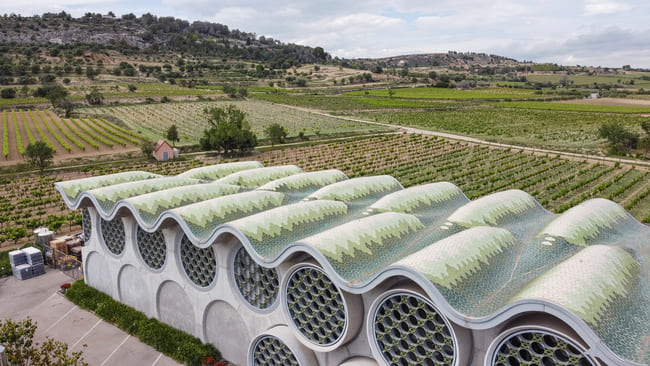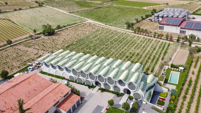 La sostenibilidad y la innovación tecnológica son la base de la filosofía de diseño de Cava & Hotel Mastinell. La cubierta continua y ondulada del edificio conforma espacios sin necesidad de tabiques interiores, creando un entorno fluido y abierto que es ideal para la ventilación cruzada. Este enfoque del diseño, además de ser muy atractivo visualmente, también minimiza la huella medioambiental. La arquitectura sostenible del hotel incluye elementos como la recogida y reutilización del agua de lluvia y una caldera de biomasa, que constituyen un ejemplo de buenas prácticas de construcción sostenible. Estos elementos garantizan un uso eficiente de la energía y el ahorro de agua, reafirmando el compromiso del hotel con la responsabilidad medioambiental.