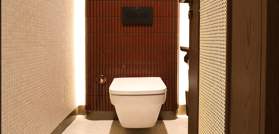 El lavabo sobre encimera de Fineceramic® Inspira Round, el inodoro suspendido Dama Rimless y la placa de accionamiento dual PL10 ofrecen una funcionalidad elegante y moderna que realza los elementos culturales tradicionales del diseño. El lavabo Inspira Round, de líneas suaves y orgánicas, refleja las curvas naturales presentes en todo el restaurante, reforzando la conexión con el Árbol de la vida. Del mismo modo, el inodoro Dama Rimless garantiza la máxima higiene y eficiencia sin renunciar a una estética sugerente. Asimismo, se optó por el escobillero de pared Victoria por su diseño minimalista y su practicidad, en línea con el compromiso del restaurante de combinar estilo y funcionalidad.