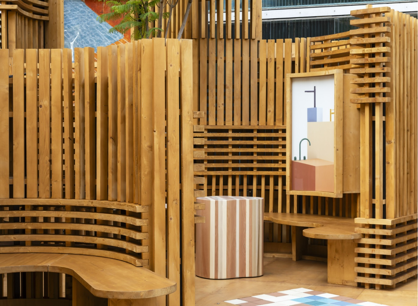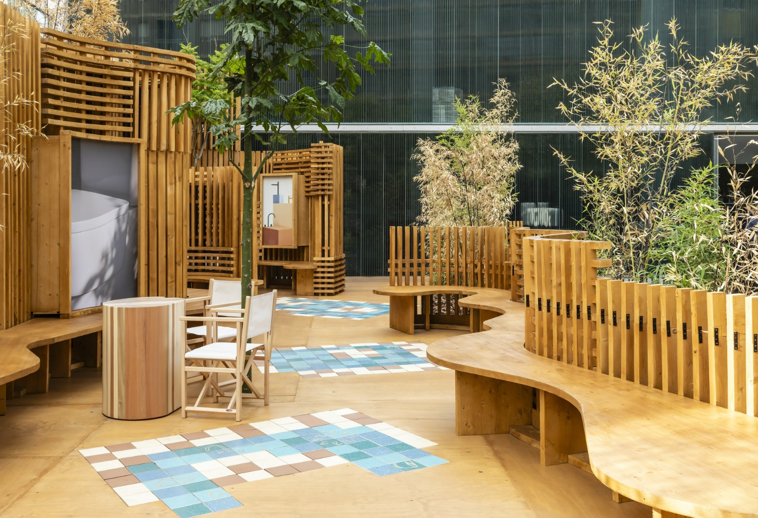 Benedetta Tagliabue describes Nutura as “a place that can be enjoyed from the inside and the outside, a place of peace and rest, built with natural elements and discovered little by little.” The pavilion’s undulating wooden and ceramic walls integrate seamlessly with Roca Gallery’s existing bamboo garden. Wooden lattices create varying levels of transparency resulting in a play of lights, shadow and texture, creating an overall sense of wellbeing and Mediterranean living. The pavilion’s floor is decorated with ceramic tiles in muted shades of blue and brown with allegorical drawings by Benedetta Tagliabue – EMBT Architects of Roca’s latest collections. These two collections lend their name to the pavilion: the Nu faucet collection, designed by Inma Bermúdez; and the Tura bathroom collection by Andreu Carulla.