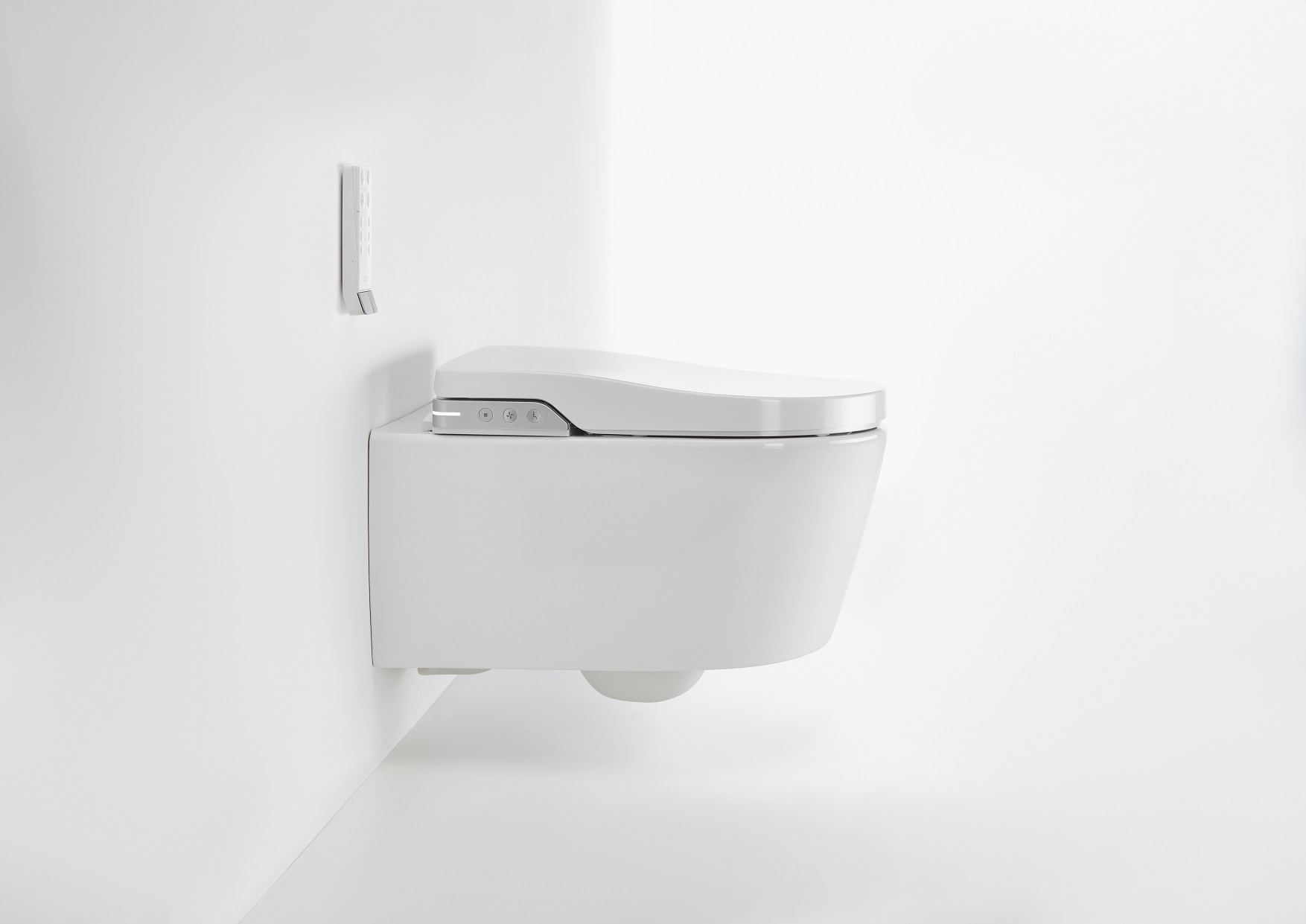 Roca’s new smart toilet offers a fully personalized washing and drying experience. The remote control adjusts the water and air temperature, the position of the nozzle and the flush option (full or partial, for greater saving of water), while the side panel can activate the full flush and the basic washing and drying functions.