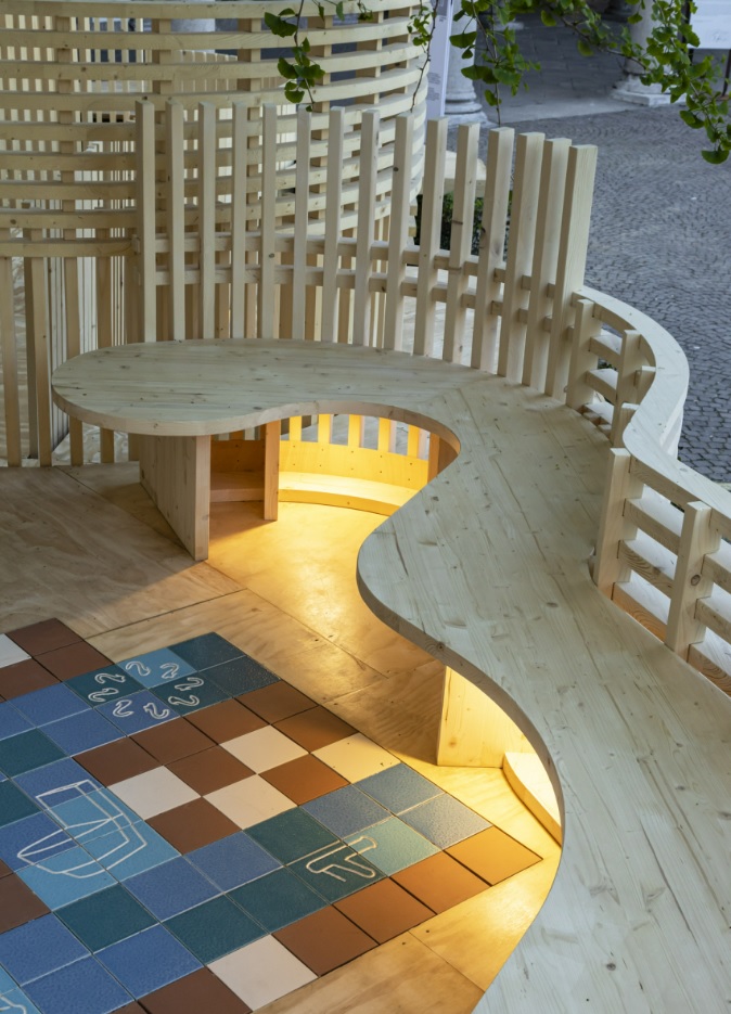 The organic shapes and the combination of neutral colours, from the different tones of brown to the various shades of blue, are reminiscent of the land and the sea. “Echoes of the Mediterranean”, Benedetta Tagliabue says, “elements of nature with which visitors slowly interact”.