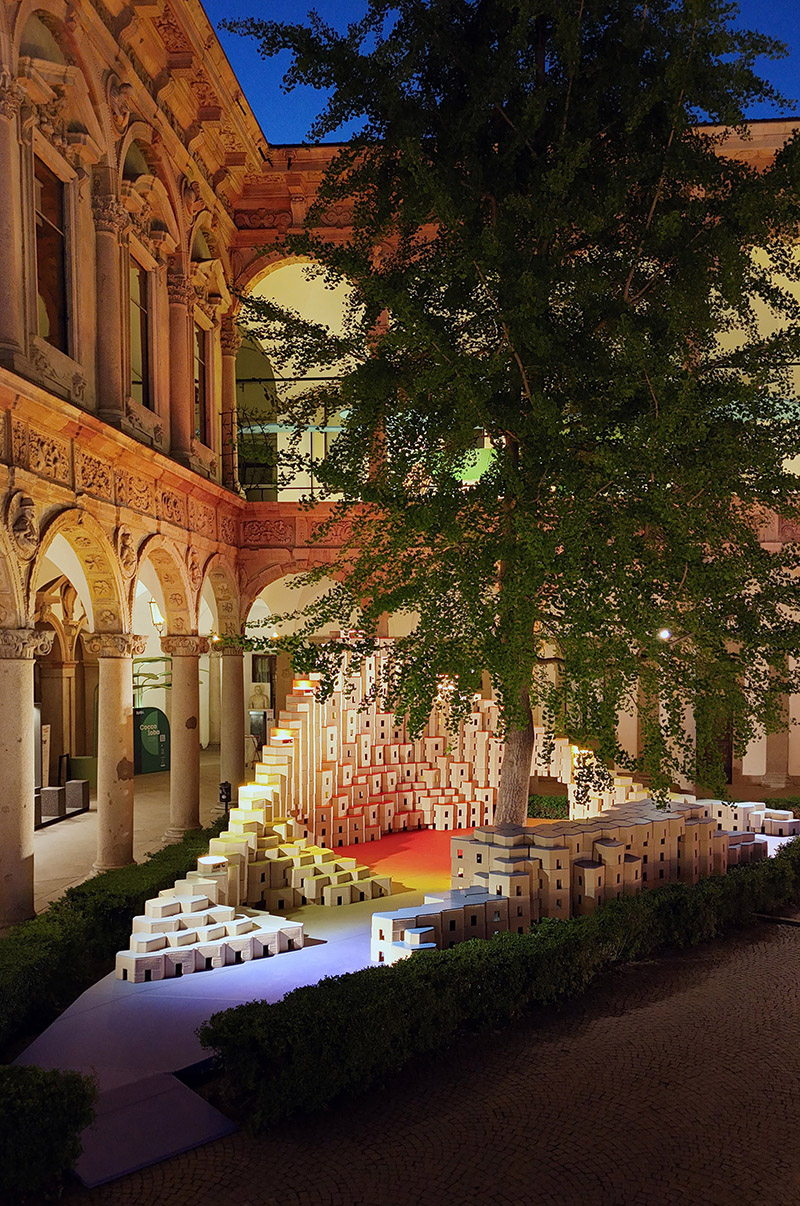 The installation's elegantly curved design with varying heights fits perfectly into the triangle-shaped plot and blends effortlessly into the courtyard of the University of Milan, offering a range of spatial and functional possibilities. More than just visually appealing, these versatile blocks become part of the narrative, transforming into inviting seating areas that encourage visitors to unwind, engage in conversation, and socialise in this dynamic space.