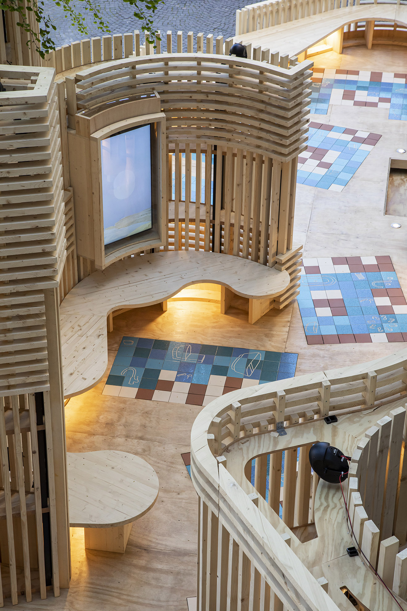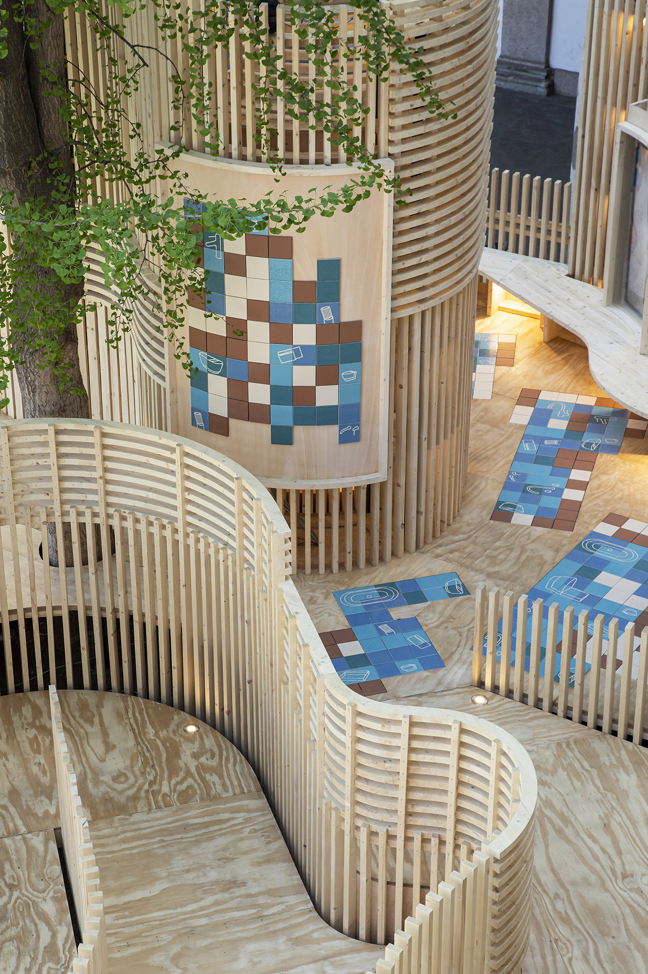 A sinuous and multisensory passage between undulating wood and ceramic walls inspired by 20th century Barcelona architecture.