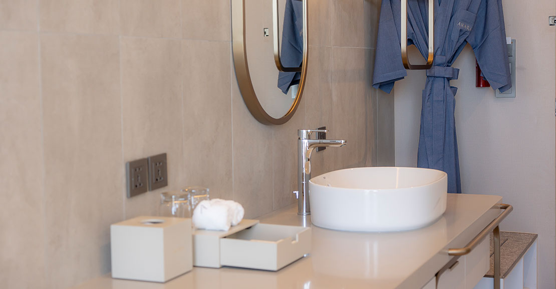 Las soluciones de baño Roca son el complemento perfecto de los espacios fluidos del hotel. El elegante inodoro Inspira, el lavabo The Gap Round y la grifería de caño alto L20 destacan por su estilo minimalista que transmite una sensación de tranquilidad y armonía. La aparente sencillez de las griferías Loft y Atlas contribuye a acentuar ese ambiente de serenidad, logrando que los huéspedes se vean transportados a un oasis de sofisticación, ya sea bañado por la luminosidad del día o por la vitalidad nocturna.