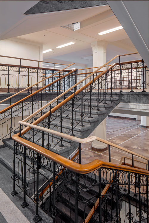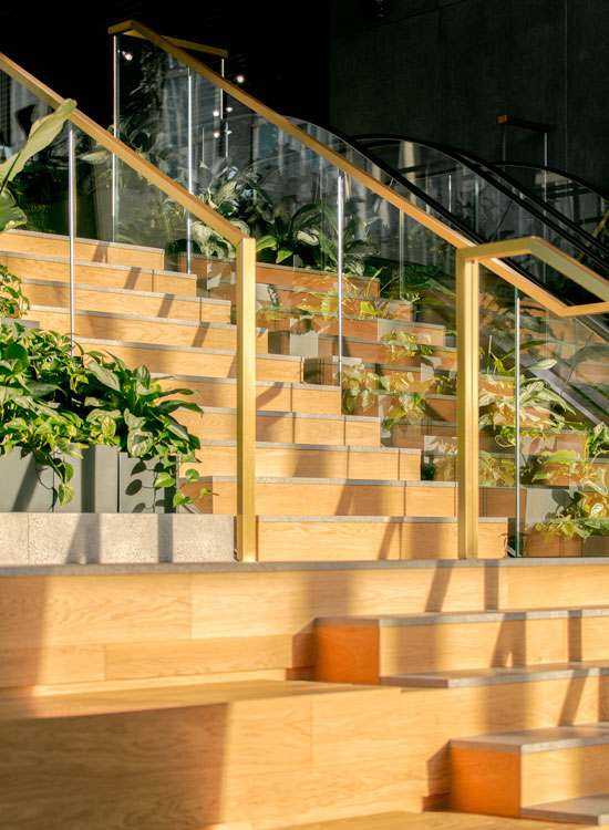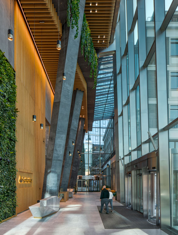 The Bridge is a marker of the ongoing transformation of Warsaw, a city that has become one of Europe’s most dynamic contemporary capitals. The glass and metal skyscraper is balanced by its double-height public lobby that pairs wood panels and accents with pockets of greenery for warmth and vitality. This merges with the Bellona’s brick façade, neo-classical columns and cast iron stairwell, architectural details that provide an important reference point for the city’s historic past. This ‘bridge’ between past and present serves as both a solution for a contemporary, mixed-use urban office building and an example for future urban planning. Roca’s expertise with sustainability, heritage properties as well as with innovative architecture made them the ideal partner in this project.