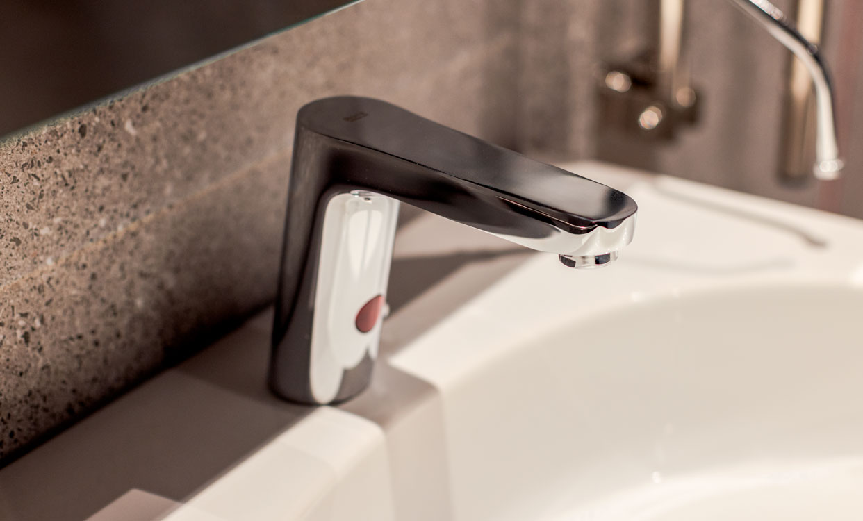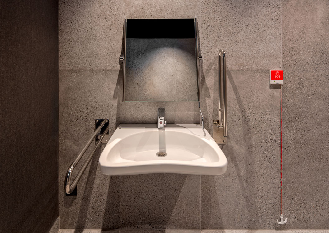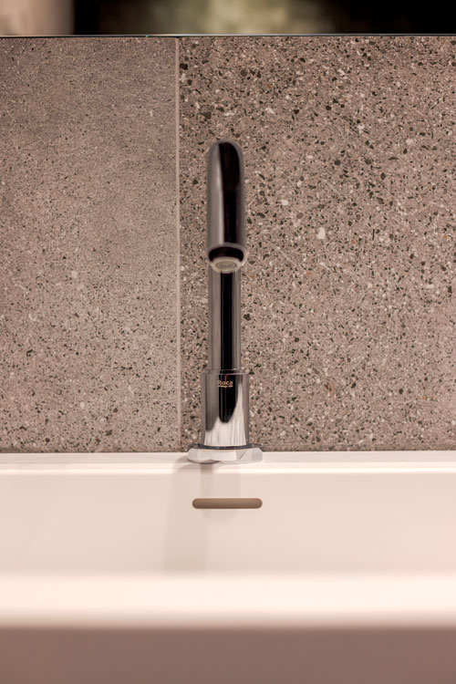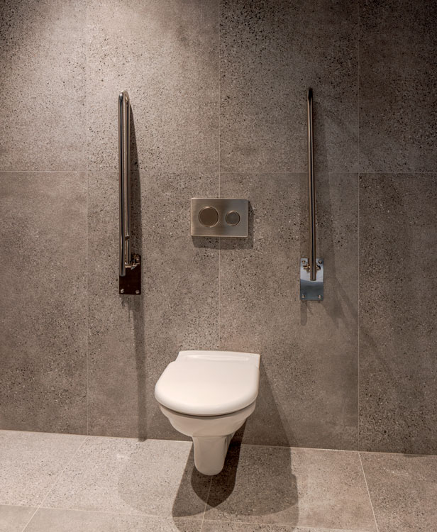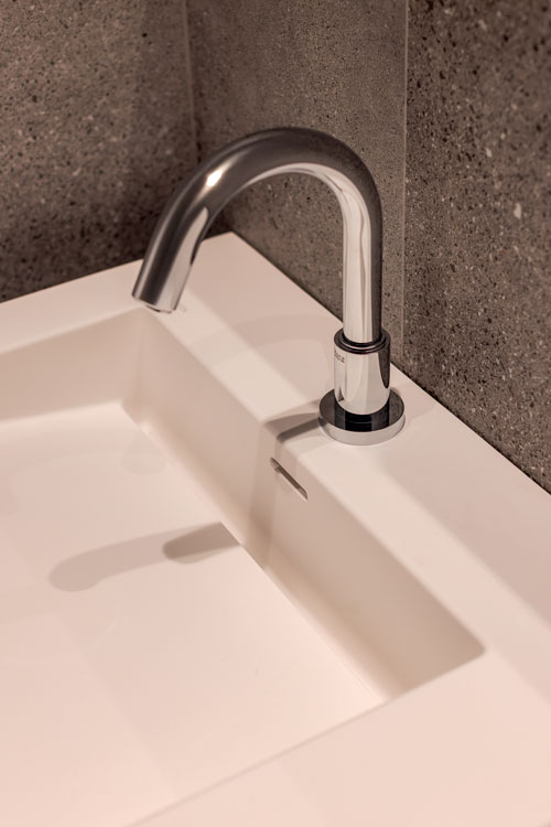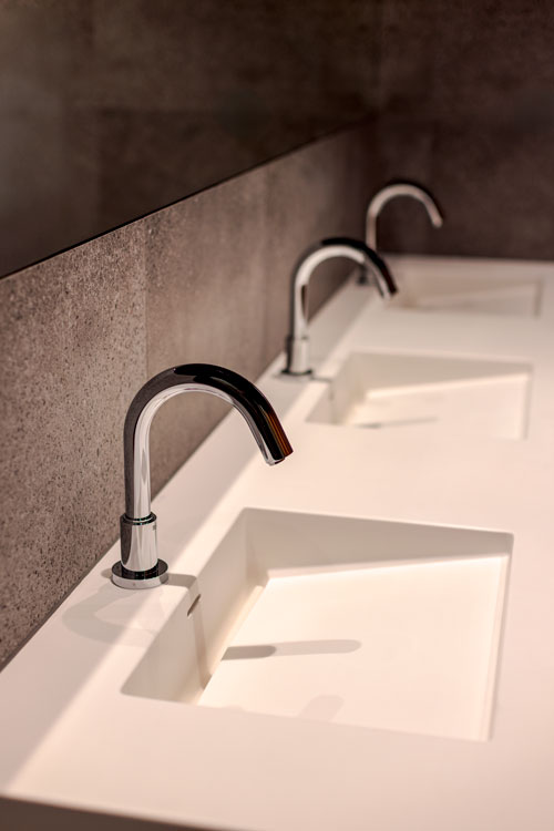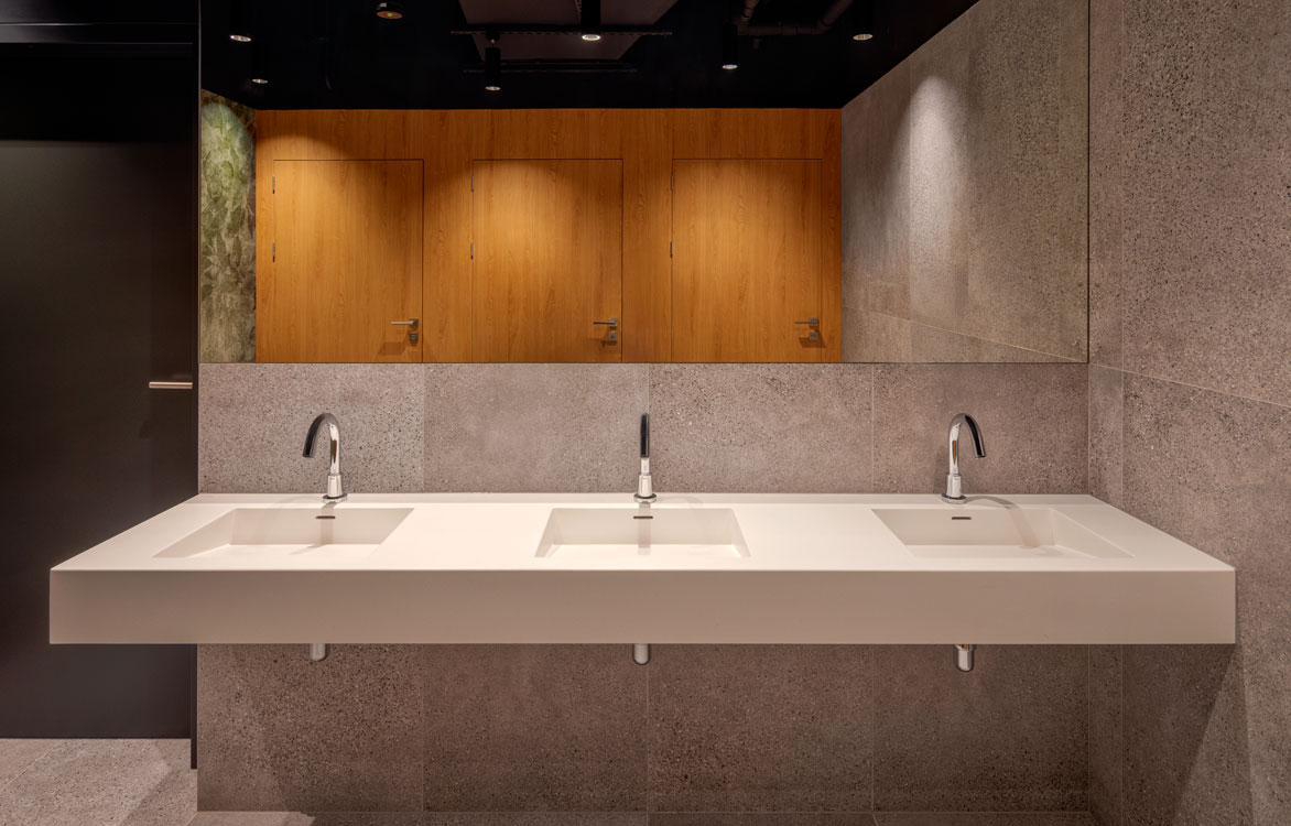 UN Studio partnered with Roca in the design of The Bridge’s contemporary, mixed-use bathroom spaces that reflect the building’s defining architectural details. The shared bathrooms are designed with grey-stone tile walls and Access wall-hung toilets basins and grab bars for comfortable, modern style. The L-30-E electronic faucets were selected for their elegant modern form and their built-in water-saving features, which are ideal in high-volume spaces. The client office bathrooms include Loft-E faucets. Refined, minimal and timeless, the bathrooms are designed for longevity.