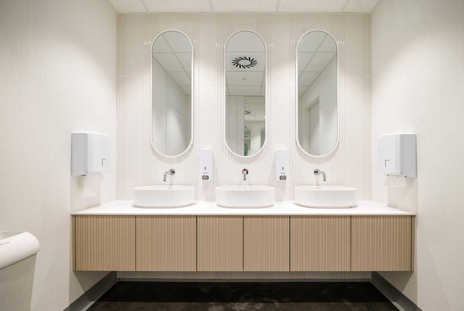 The project was overseen by the Municipal Conservator of Monuments, ensuring the architecture would add value to the area and be a model for future architecture. The business incubator supports the activities of local companies, often within the economic sector, and therefore required a range of private offices and communal spaces, including spacious co-working spaces, conference rooms, one of which holds up to 200 people, and an audio-video recording room for podcasts and interviews. The team worked with Roca on its plans for a series of communal and private bathroom spaces across the building. The bathrooms needed to reinforce the design’s focus on energy efficiency while appealing to a dynamic and contemporary setting.