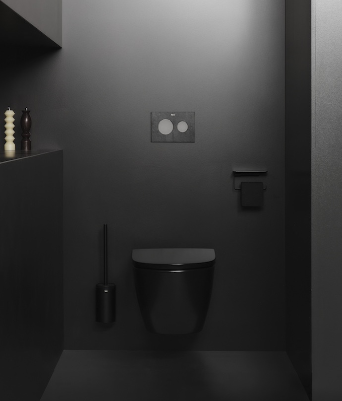 Ona matt black wall hung toilet combined with the PS4 operating plate and the Allegro wall mounted toilet brush.