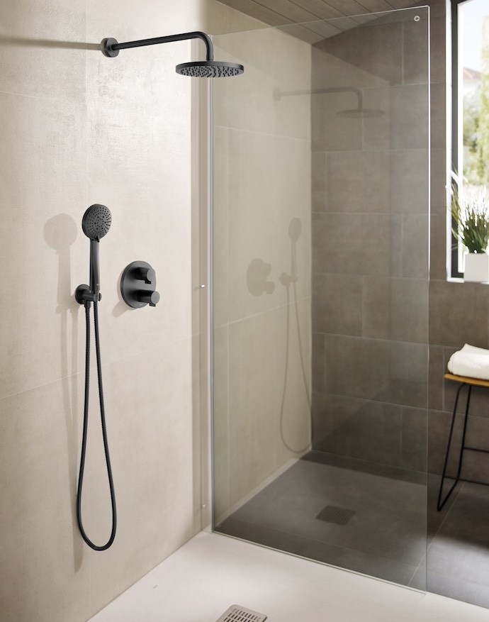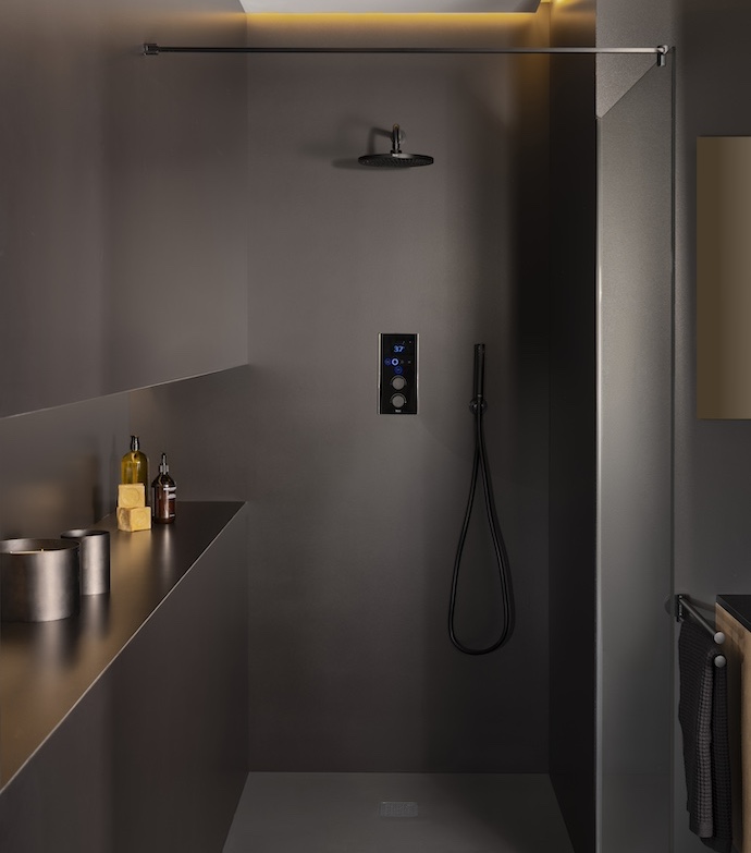 The shower space is another part of the bathroom that can easily adapt to the industrial design style. Matt black or chrome finish shower systems including Cala, Plenum or Sensum collections, or the T-500 thermostatic shower mixer with Stella shower set, combine well with this design look. Bringing in the smart shower system will create a contemporary shower experience with automated controls and settings.