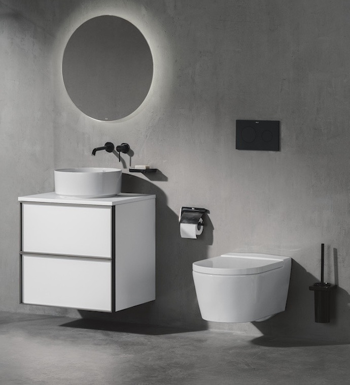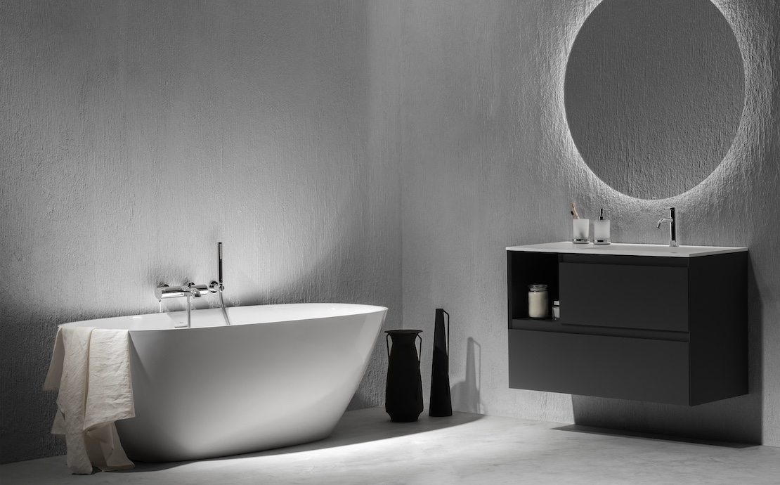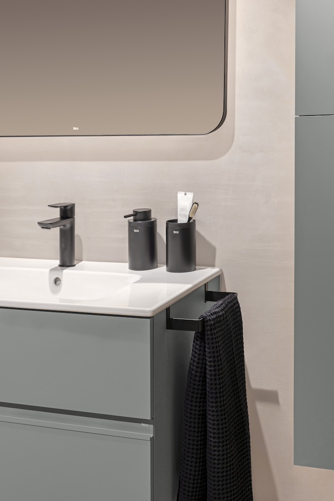 Shape and form are also key elements of industrial bathroom design. Characterised by bold lines, tubular or rounded edges, and a minimalist aesthetic, the look is modern and sophisticated with an underlying urban appeal. Tenue collection’s clean, minimal design, with its seamless basin and base unit, easily adapts to an industrial design look Inspira is a bold choice for an industrial design style, featuring modular Fineceramic® basins and a dynamic furniture base with a contrasting framed border. Its sand grey and magnolia finish showcase how materials and colors blend seamlessly in an industrial aesthetic.