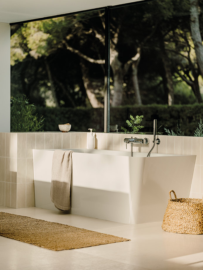 For those who love to spend lots of time in the bath, accessories like trays, such as Tura collection’s FSC certified wood tray that fits perfectly along the inside rim of the bath and lets you place a book or a glass of wine, along with Tura’s fabric headrest, made with recycled fabrics, are must-haves. Aromatherapy oils, candles, and bath salts further enhance the sensory experience, turning a simple bath into a rejuvenating ritual.