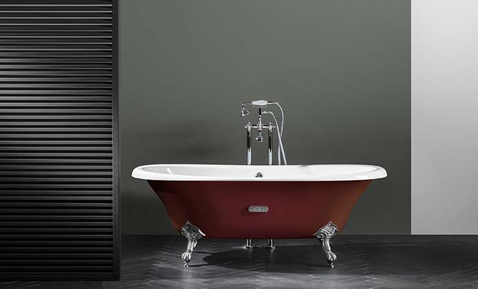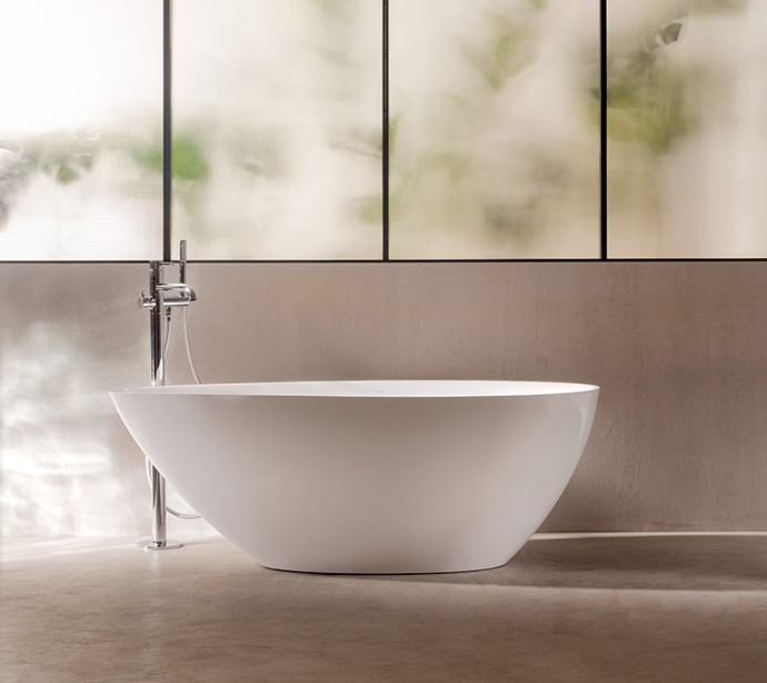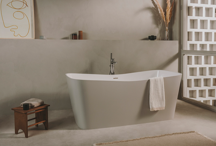 Freestanding baths have long been a popular for those with larger bathroom spaces. These baths are statement pieces, often designed with smooth, sculptural lines that make them the focal point of the bathroom. Freestanding baths can come in various shapes and materials, from the classic clawfoot designs, as seen on the Newcast collection, to modern, minimalist models made with Stonex®, a material that allows for more flexibility in design and shape. The Tura bath, made with Stonex®, is designed with a softly curved back and subtly stacking shapes that makes it appear as if it is floating in space. It can also come with an integrated LED light at the base that allows you to create a moody, perfectly lit space while taking a soak. The Ariane collection is the biggest bath made with Stonex® and has a curvaceous, voluminous shape that welcomes two comfortably.