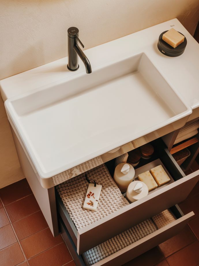 Not all drawers are created equal, and in the bathroom, details matter. Here’s what to keep in mind. How many people will be using the bathroom? Do you need two, three or four drawers. Or is one well-organised drawer sufficient for your everyday? The Gap and Inspira collections offer elegant two, three or four drawer options and Tura collection, with its timeless one-drawer unit and lower shelf, is ideal for small bathroom spaces or for one user. Ona collection’s compact unit is also one to consider for smaller bathrooms.
