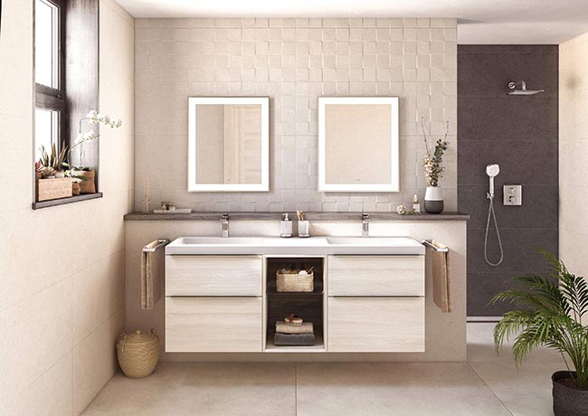 In modern bathrooms with an urban style, Beyond is the perfect choice due to its innovative design. There are up to four dimensions that range from 600 mm with two drawers to 1600 mm with four to adapt to your space and meet your storage needs. You can opt for a refined basin in Surfex® in pure White or for the delicateness of Fineceramic® in six different colors. Find your perfect combination with one of the four available finishes for the furniture unit – Gloss White, Nordic Ash, Textured City Oak or Arctic Grey- and the result will be a design with a marked contemporary character.