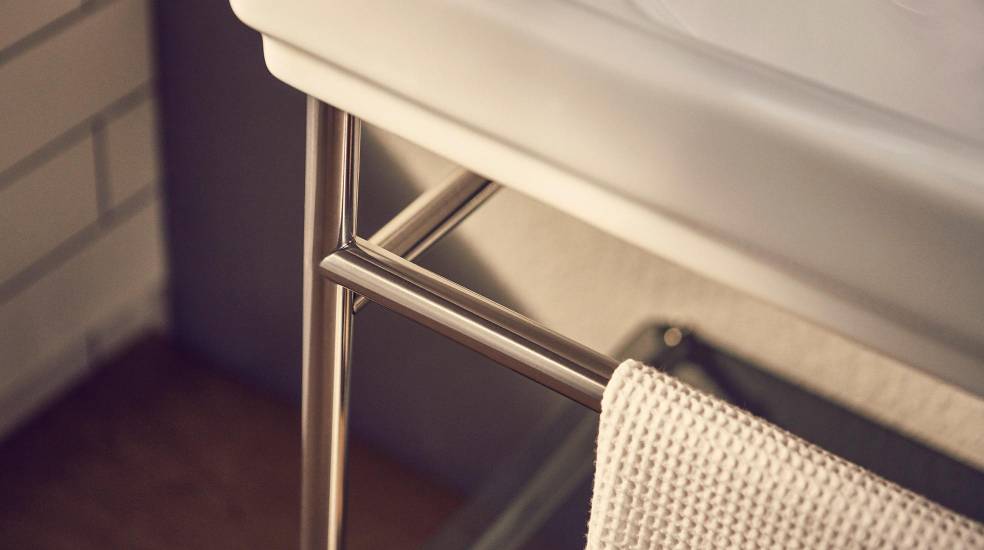 By reinterpreting the most charismatic vintage basins, the evocative Carmen collection opts for an open metal bathroom vanity, full of memories. Manufactured in stainless steel, this structure unit for vanity basin is wall-mounted, while its two legs, with a sophisticated curved outline, rest on the floor.