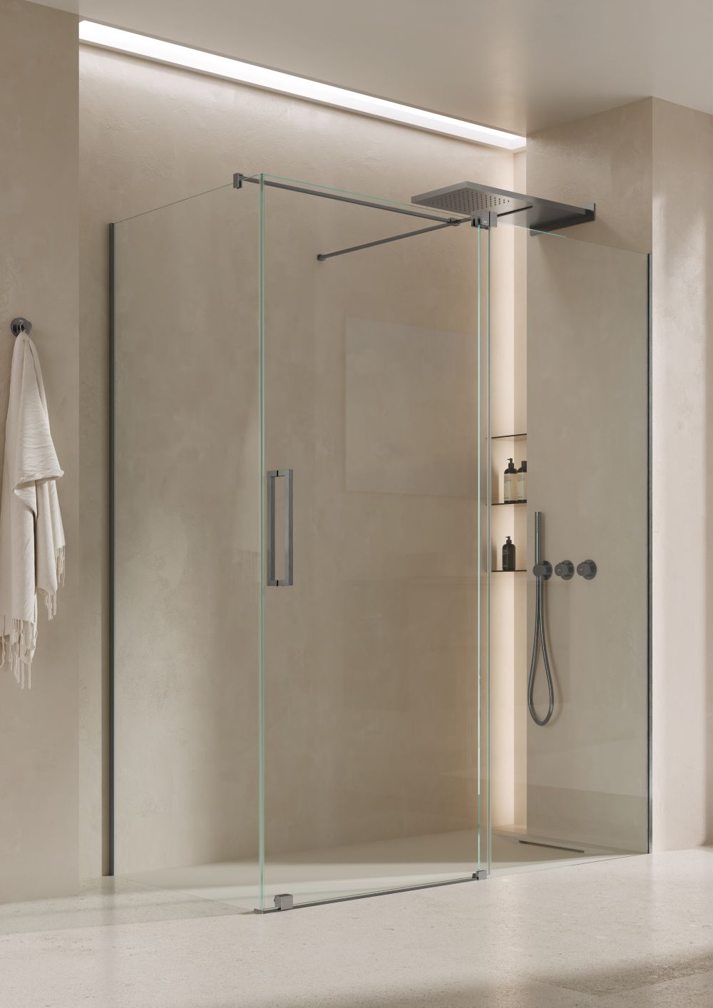 When it comes to design, replacing a bath with a walk-in shower visually opens up the bathroom making the space feel larger, more open and light-filled. There is a cohesiveness to the bathroom when the shower is naturally integrated in the space with subtle design details that define it. Elements such as transparent shower enclosures that reflect natural and artificial light, give the illusion of more space. Using transparent shower enclosures such as Ura’s fixed panel or Line collection’s frameless fixed, pivot and hinged glass enclosures, you can customise the size and layout of your ideal shower.