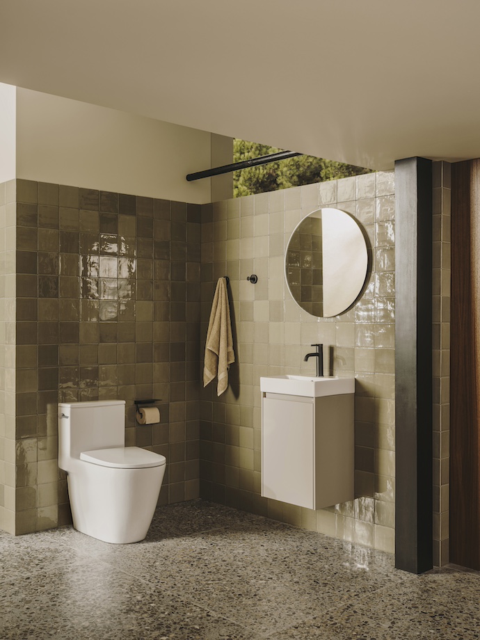 The accessories from the Ona and Tura collections, like soap dispensers and containers, are the perfect complement to keep everything tidy without compromising on design. Moreover, their sand grey or matt green finishes blend effortlessly with natural-coloured furniture and wall tiles, creating a harmonious aesthetic that makes the bathroom feel warm and inviting.