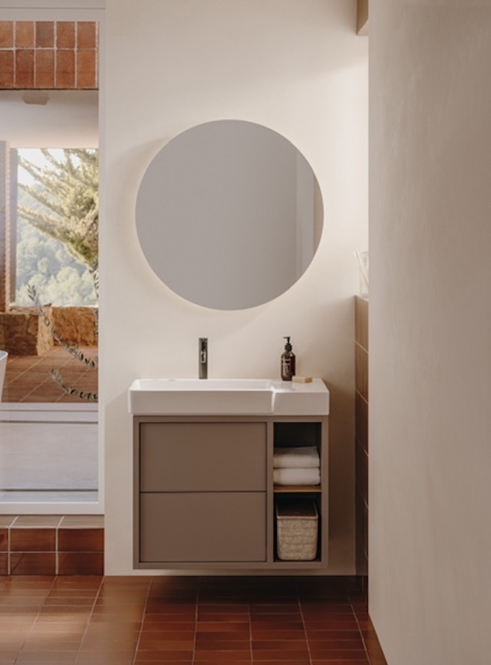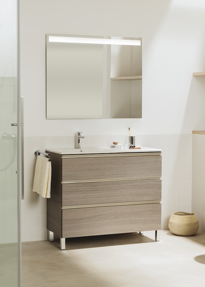The Tura collection also features base units in light terracotta that bring calm and elegance to any environment. This earthy tone blends seamlessly with white or sand grey accessories to create a balanced and welcoming atmosphere. However, if you prefer other options, the collection also offers other alternatives in light noble grey.